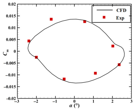 Because the process of the oscillation of dynamic MVGs was simulated based on a dynamic grid, the accuracy of the unsteady numerical simulations combined with the dynamic grid was further verified. The transient numerical simulation of the oscillations and transient pitch of the NACA0012 airfoil were carried out, and the numerical results were compared with those from the experiments [35]. In the experiments, the reference point of the pitch of oscillations of the wing was 0.25 times the chord length, and the oscillation motion is defined by: , where α and ε are the angle of attack and the phase angle depending on the time reference, respectively; α0 is the initial angle of attack; and αm is the amplitude of the angle of attack. The values of αm, α0, and ω were 2.51°, 0.016°, and 392.5, respectively. Figure 7 shows the hysteretical curve of the coefficient of the pitching moment Cm with the angle of attack α, as obtained from numerical simulations of the NACA0012 airfoil. In the figure, it is clear to see that the numerical result was close to the experimental data, and the maximum error between them was no more than ±5%. Therefore, the unsteady numerical simulations with the dynamic grid technique were determined to be adequately accurate.