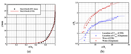 To validate the predictive capability of the model of turbulence used for vortices induced by the vortex generator, the experimental results of Giepman [36] were selected for testing. The parameters set in the simulation were consistent with the experimental conditions. The Mach number of the incoming flow was Ma = 2.0, and the height of the vortex generator was hv = 8.0 mm. According to the results of 3D particle image velocimetry (PIV) experiments in Ref. [36], the nominal thickness of the boundary layer was δ = 17.5 mm, and the shape factor was H = 2.85 when the vortex generator was not installed. The time-averaged velocity distribution of the boundary layer at this location was obtained from experiments and simulations, as shown in Figure 8a. The characteristics of the distribution of velocity in the downstream wake of the vortex generator need to be measured to assess the control effect. The normal positional distributions of the maximum velocity Vmax and the minimum wake-induced velocity Vmin on the symmetric surface at different flow stations shown in Figure 8b were obtained through the simulations. Figure 8 also shows that the results of Giepman’s experiments and simulations were in good agreement with that of our experiments and simulations. The position of Vmax on the symmetric surface was consistent with the experimental measurements along the direction of the flow, and the maximum difference between the positions was only 0.2hv in the range of hv < x < 27.5hv. The value of Vmin of the wake was within the scope of hv < x < 27.5hv, and the maximum difference between its positions in the experiment and the simulation was only 0.1hv. This shows that the unsteady simulations used in this paper can be used to obtain the complex vortex-induced flow fields within the specific range of the accuracy requirements.