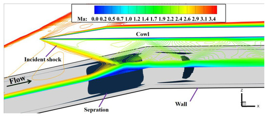 Firstly, the 3D flow inside the inlet without dynamic MVG control was investigated. Figure 10 shows contours of the Mach number on the plane of symmetry of the inlet and the iso-surface of zero velocity at it (the blue curved surface in the figure). The figure shows that the SWBLI led to substantial boundary layer separation at the inlet under this condition, and an extensive range of low-momentum flows were accumulated along the direction of the flow near the side walls, which caused the flow field to exhibit strong three-dimensionality.