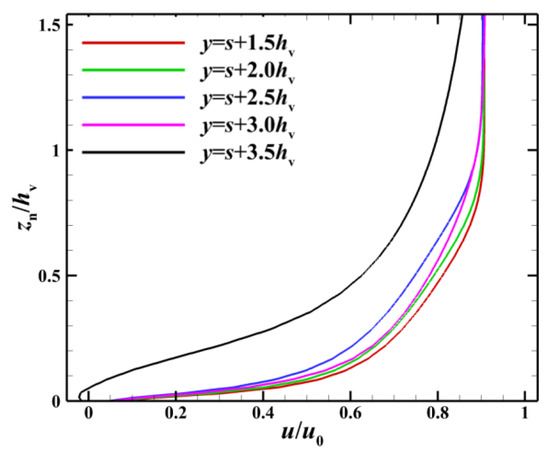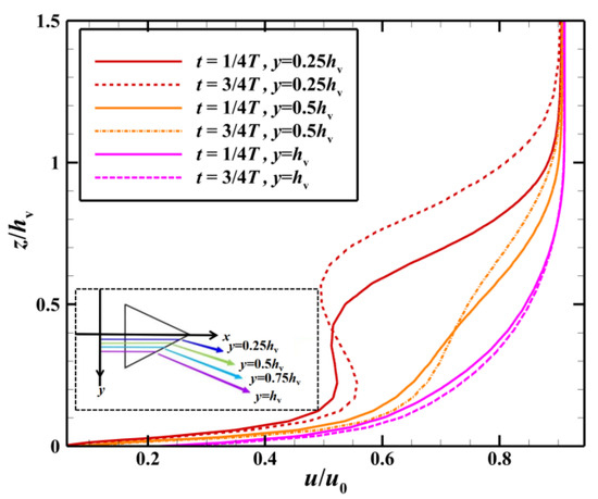 Figure 16 shows the time-averaged velocity profiles at the boundary layer at different streamwise positions after the array of dynamic MVGs and includes a schematic diagram of different spanwise positions (shown in the lower-left corner). The velocity u and the distance zn (i.e., the normal distance to the bottom wall of the inlet) were non-dimensionalized by the mainstream velocity u0 and the height of the vortex generator hv. To illustrate the influence of the vortex generator, the velocity distribution at the boundary layer without the vortex generator control is also shown in Figure 16. At the location of x/h = 4.7, the boundary layer velocity distribution at different spanwise positions throughout one cycle is presented. The boundary layer had the same distribution at different spanwise positions except at the plane of symmetry (y = 0hv). The profile of the near-wall boundary layer was relatively thin when the vortex generator was completely embedded into the wall (t = 0T). The profile of the boundary layer became fuller as the vortex generator slowly oscillated upward and became full when it swung to the highest point (t = 1/2T). As the spanwise position gradually moved away from the plane of symmetry y = 0hv, the velocity of the near-wall boundary layer increased on the spanwise plane of y = 0.5hv and further increased at spanwise planes of y = 0.75hv and y = hv. Therefore, the best position for controlling the flow was not on the plane of symmetry y = 0hv but at positions at a certain distance from it. In addition, the near-wall boundary layer at any streamwise position under dynamic MVG control was fuller than that under the uncontrolled condition. This indicates that the array of dynamic MVGs could increase the momentum in the near-wall region and enable the boundary layer to overcome the strong adverse pressure gradient induced by the cowl shock.