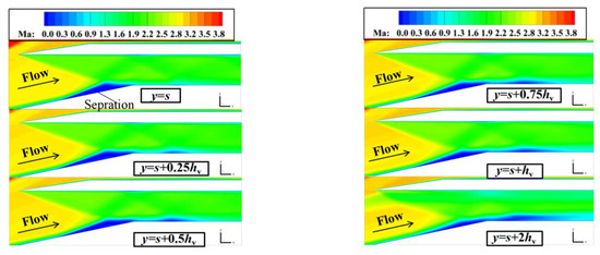The spreading slices at different spanwise positions were used for further analysis. The distributions of the Mach number on different slices in the uncontrolled case in Figure 13 shows that the zone of separation gradually became shorter from the plane of symmetry (y = s) to the slice near the side wall. The shape of the separation near the side wall (y = s + 2hv) changed considerably because the glancing interaction between the shock and the boundary layer of the side wall dominated the flow near the latter. It is clear that there was a strong transverse flow at the bottom wall of the inlet. Under its influence, the separated boundary layer was squeezed by the flow of the side wall so that the separation was more significant near the plane of symmetry (y = s).