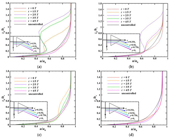 Profiles of the boundary layer at different spanwise positions at x/h = 4.7 at five typical times within one cycle. (a) y = 0hv. (b) y = 0.5hv. (c) y = 0.75hv. (d) y = hv.