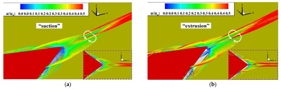 The above analysis indicates that the vortex generator has a unique collection function for the near-wall boundary layer. It is clear from the distribution of streamlines around the dynamic MVG shown in Figure 18 that although, when it swung down to t = 3/4T, the height of the vortex generator was the same as that at t = 1/4T, the airflow below it was extruded by its trailing edge at t = 3/4T, while only prominent suction was observed at t = 1/4T. When the vortex generator swung upward, air flowed into the cavity below it from both sides. The typical profile of the velocity of the boundary layer at the position shown in Figure 19 indicates a significant increase in the near-wall velocity at t = 3/4T compared with that at t = 1/4T, indicating that the unique “extrusion” and “suction” functions of the dynamic MVG continued to charge the airflow.