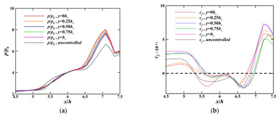 Figure 21 shows the distributions of the time-averaged static pressure and wall friction coefficient cf along the wall. The method proposed by Kendall and Koochesfahani [38] was used to estimate the friction velocity uτ. The wall shear stress τw can be calculated using the relation . The wall friction coefficient was . Increasing the local cf value can delay the separation and reduce the disturbance area at the same time. Therefore, the cf value reflects the flow field characteristics and control effect of the SWBLI [39]. The solid lines represent the time-averaged wall static pressure, and the dashed lines represent the distribution of cf on the wall. The static pressure on the wall at different spanwise positions in the separation when the array of dynamic MVGs was used was significantly lower than in the uncontrolled flow field, indicating that the array could reduce local high pressure near the separation. The distribution of cf of the wall on the corresponding xoz plane showed that the uncontrolled state had a shear stress on the wall opposite to the flow direction in the separation (x/h = 5.30~x/h = 7.00). The velocity gradient was negative, which is highly unfavorable for the efficiency of the inlet. However, the reverse shear stress at each spanwise position was reduced in the case involving control. The effects on the shear stress in the separation at y = 0.5hv (x/h = 5.65~x/h = 6.81) and y = 0.75hv (x/h = 5.61~x/h = 6.92) were better with control than without it. The length of the separation could be reduced by up to 31.76% compared with the uncontrolled case. However, the plane of symmetry y = 0hv was located in an area in which the two inner vortices interfered with each other, and the control effect was not as good as that at the other spanwise planes, which is consistent with the above discussion on the distribution of the time-averaged Mach number. In summary, the array of dynamic MVGs was able to reduce local high pressure near the separation and improve the downstream cf of the wall.