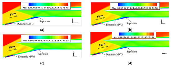Contours of the Mach number of the array of dynamic MVGs at different times: (a) t = 0T, (b) t = 1/4T, (c) t = 1/2T, (d) t = 3/4T.