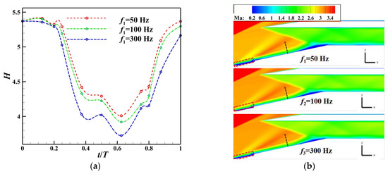 Contours of the mean Mach number and changes in the shape factor at different frequencies of oscillation at y = 0.25hv. (a) Changes in the H at different times. (b) Changes in the contour of the mean Mach number.
