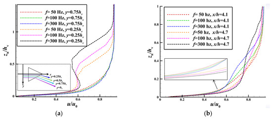 Changes in velocity at different frequencies of oscillation. (a) Velocity distributions at different spanwise positions (x/h = 4.7). (b) Velocity distributions at different streamwise positions (y = 0.5hv).