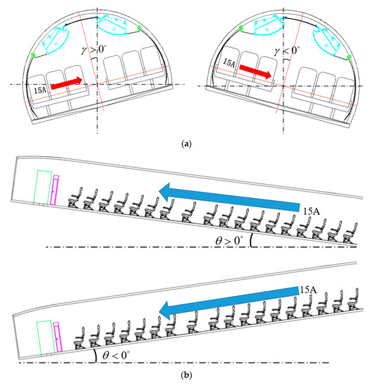 However, the speed of the passengers on a plane will be affected by the pitch/roll state. In an actual accident, the aircraft may be in an unfavorable position after a forced landing [18]. The unfavorable position will affect the speed of the personnel’s movement and the evacuation efficiency [19]. When there is a rolling or a pitch angle, the gait of the passengers on board changes, leading to changes in their movement speed [18]. In addition, changes in friction between passengers’ soles and the ground will also have a considerable impact [20], causing a loss of personal speed.