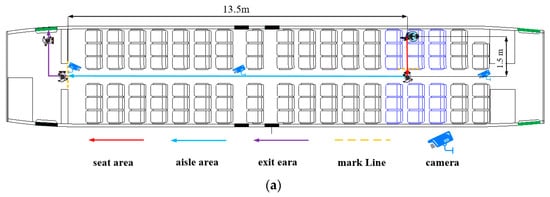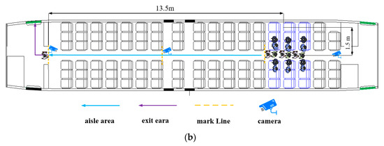 Experiments and numerical simulation research on aircraft cabin safety evacuation have been widely reported. However, in most contributions, the cabin’s overall evacuation time and evacuation efficiency under a conventional situation were considered. Mclean and others studied the impact of aircraft emergency exits’ features on the evacuation time and factors such as seat configuration, channel width, group motivation, and individual characteristics on the exit evacuation efficiency [4,5,6,7]. Muir et al. researched the impact of smoke and motivation on the evacuation time [8,9]. Wilson and others studied different cabin layouts and evacuation times of wing exit layouts [10,11]. There are only a few simulation studies that emphasized the impact of the cabin structure on the speed of the personnel. The speed of the personnel movement is an important parameter that determines the evacuation performance of an aircraft, which is affected by the complexity of the environmental structure. In recent years, research on aircraft cabin evacuation has mainly used numerical simulations. Galea and others developed evacuation simulation software for large and wing-tier passenger aircraft [12]. Kirchner and others considered the competitive behavior of individual passengers in the emergency evacuation of a plane [13]. Xue and Yu and others considered the impact of passengers’ physical characteristics on the evacuation time of aircraft [14]. Most research has focused on evacuation movements in aircraft in a horizontal state and used numerical simulations or data statistics [15,16,17].