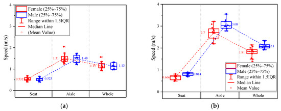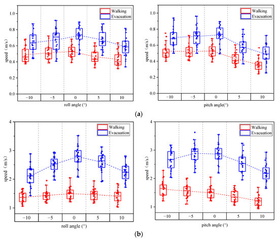 Statistical diagram showing changes in individual speed in different areas with changes in the pitch/roll angle: (a) seat area; (b) aisle area.