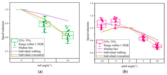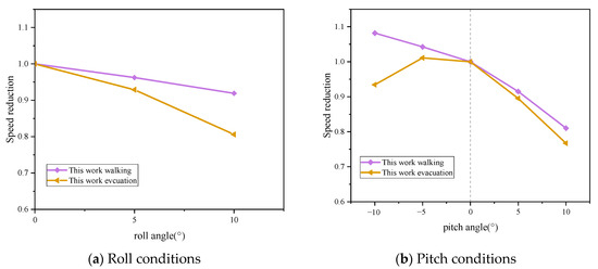 In order to clearly present the changes in individual movement speed, the average speed reduction at different pitch/roll angles (defined as the ratio of individual movement speed under inclined conditions to that under normal conditions) was calculated, as shown in Figure 8. In order to facilitate the discussion considering the results of other experimental research, the individual speed in the aisle area was selected as the calculation object, similar to the experimental conditions in others’ studies.