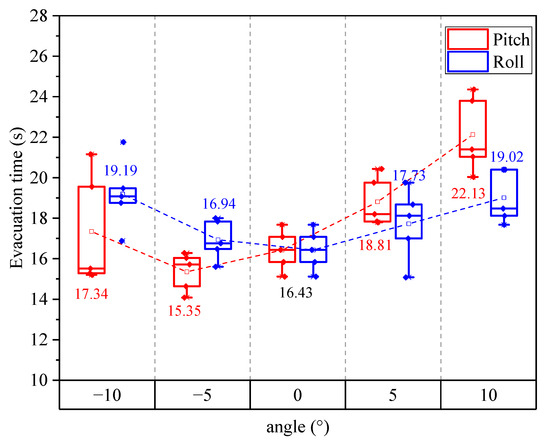 The evacuation time is the most important parameter for evaluating the evacuation efficiency. Figure 9 shows the evacuation time of repeated experiments at different pitch/roll angles. It can be seen that, except for the pitch angle θ = −5°, all other angles increased the evacuation time, and the larger the angle, the longer the evacuation time. Compared to the roll angle, the same pitch angle had a more significant impact and led to higher dispersion in the evacuation time results. A one-way ANOVA was undertaken; the results showed that the group evacuation time significantly changed with the roll angle (F = 3.793, p = 0.0187) and pitch angle (F = 11.683, p < 0.001) at a 95% confidence level.