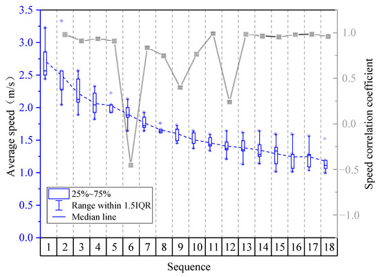 The average evacuation speed observed in the experiments in the normal walking mode is shown in Figure 10. With an increase in the evacuation sequence, the average evacuation speed of single individuals in the entire process and observation area gradually decreased, and the speed difference between the front and the rear order personnel gradually reduced and finally stabilized at 1.22 ± 0.23 m/s. This result is related to the density changes in the aisle area. During evacuation, the person who entered the aisle first had enough space to accelerate. Due to the restrictions on traffic at the exit door, the speed of a passenger entering the aisle was greater than that of one leaving the aisle, the crowdedness in the aisle area continued to increase, and the movement speed decreased.