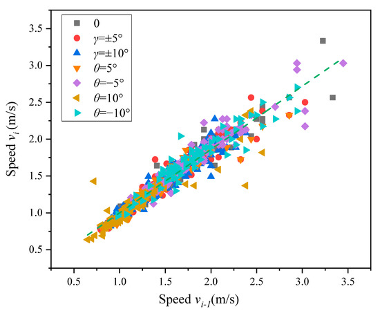 The efficiency of group evacuation is determined by the speed of individual passengers in the group. Research has shown that the distance from the passenger in front and the current velocity affect a passenger’s acceleration, thereby determining the movement of the entire population [33]. According to the experimental results of this article, it can be concluded that the individual movement speed during the group evacuation process of the cabin is mainly influenced by the movement speed of the individual in front, the size of the pitch/roll angles, the distance headway, and the time headway. Therefore, these data could be used to establish a motion model for individual passenger speed in group evacuation under unfavorable attitudes, with the specific relationship as follows: