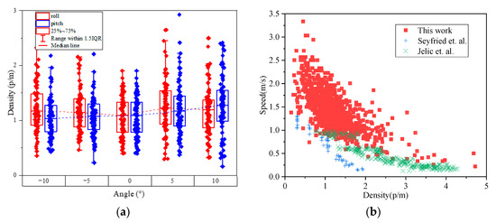The fundamental diagram of passengers shows a relation between the passenger speed and the passenger density [21,22]. The speed of individuals during group evacuation was mainly influenced by the passenger density. The fundamental diagram of passenger density and speed under different pitch/roll angles in the aisle area is shown in Figure 13a. With a change in the roll/pitch angles, the density distribution showed an insignificant change, which indicated that the pitch/roll had no direct effect on the passenger density. It could also be concluded through ANOVA that the roll angle (F = 1.927, p = 0.1050) and pitch angle (F = 2.199, p = 0.0683) had a statistically insignificant influence on the passenger density in group evacuation. As shown in Figure 13b, compared with other studies, this experiment had fewer data points in extremely high-density areas (ρ > 2 p/m), and most data refer to normal-density areas (0 > ρ > 2 p/m). On the one hand, this is because the linear density of passengers in the aisle area increased as the passengers entered the aisle. When the density reached a high value, most passengers were at the end of the aisle or had passed the aisle, and only a few passengers needed to be evacuated. On the other hand, most passengers kept a particular distance from the passenger in front during the evacuation, so that the passenger’s linear density did not reach a high value. This result can suggest the passenger density range of real group evacuation in the aircraft cabin.
