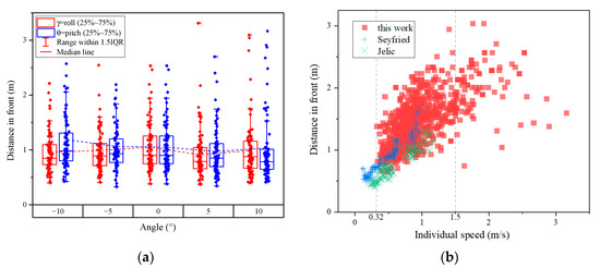 The distance from the passenger in front distribution is an important parameter for quantifying the spatial distribution of group motion and also affects the speed at which individuals move within a group [31]. The distance of a passenger from the preceding passenger was measured in the aisle area, and the relationship between the distance from the passenger in front and the pitch/roll angle as well as the individual speed was analyzed. The statistics of the distance from the passenger in front under different pitch/roll angles is shown in Figure 14a. As the angles increased, there was no significant change in the distribution of the distance headway. It can also be concluded through ANOV that, the roll angle (F = 1.058, p = 0.3771) and pitch angle (F = 1.228, p = 0.2983) were statistically insignificant to the distance from the passenger in front in group evacuation. The relationship between the distance from the passenger in front and the individual speed in the aisle area is shown in Figure 14b. In this experiment, the individual did not move until the distance from the preceding passenger was greater than 0.32 m, indicating that the minimum safe distance (d0) maintained between individuals was 0.32 m. When the distance from the passenger in front exceeded 1.5 m, there was no significant relationship between the individual speed and the distance from the passenger in front. Overall, the individual movement speed showed an upward trend with increased headway distance. In addition, as all the experimental passengers were required to evacuate as fast as they could, the individual speed in this work showed a larger value than in other studies in which the experimental subjects were required to walk. Different from other research, which presented a narrow difference, the experimental results in this work showed a much broader range in the distance from the passenger in front for the same individual walking speed, which might be due to the different experimental conditions.