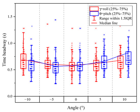 It was concluded from the individual movement experiments that the pitch/roll angles can affect the passenger speed. So, the speed should be disregarded to analyze the effect of the pitch/roll angles on the group evacuation characteristics. According to Formula (6), the distance from the passenger in front can be split into the product of the forward passenger’s speed and the time headway, from which the time headway of the passenger in the aisle area under different experimental conditions can be calculated. The time headway distribution is an important value that characterizes the spatial distribution of individuals in evacuation movements [32]. The time headway under different pitch/roll angles is shown in Figure 15. It can be seen that the average time headway interval increased significantly as the angle increased. It could also be concluded through ANOVA that the roll angle (F = 4.784, p < 0.001) and pitch angle (F = 5.150, p < 0.001) were statistically significant to the time headway in group evacuation. It can be deduced that in group evacuation, the pitch/roll angles will affect not only the individual speed but also the time headway between individuals. The two influence laws are similar, as both appeared to have a linear relationship, and the pitch angle had the larger impact. Therefore, the relationship between the average time headway and the angle could be obtained using the same fitting method as follows: