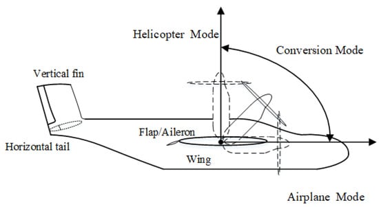 Atilt-rotor aircraft combines the vertical takeoff and landing capabilities of a helicopter, and the high speed and range capabilities of a fixed-wing aircraft. It consists of three flight modes: helicopter mode, fixed-wing aircraft mode, and conversion mode. Conversion between helicopter mode and fixed-wing aircraft mode is completed by tilting the nacelle of the engine, as shown in Figure 1 [].