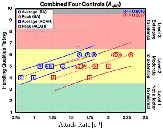 HQR vs. peak and average AηRC for combined controls []. AηRC is an adaptive metric calculated based on helicopter pilot control stick input data. Numbers: Case number, lines: AηRC, dotted lines: best fit straight-line between the HQRs and AηRC.