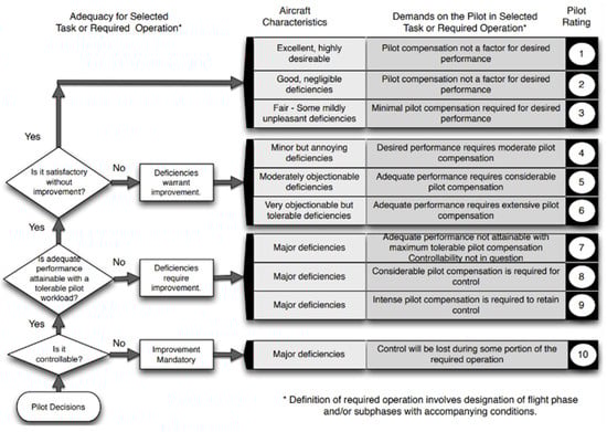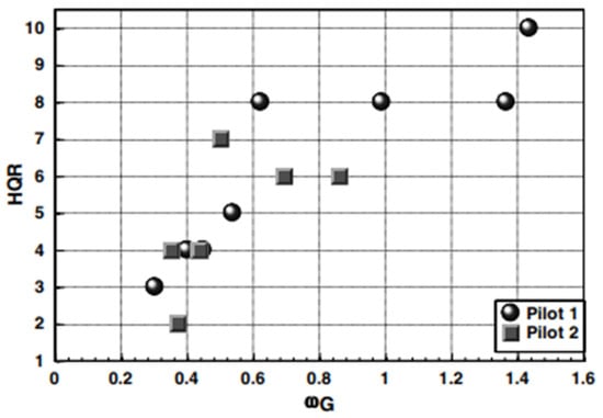 By observing the control strategy descriptions corresponding to component ranges of different frequencies in Figure 4 and considering the pilot’s handling qualities rating (HQR) based on the Cooper–Harper scale, as shown in Figure 12 [], a correspondence can be found between the two.