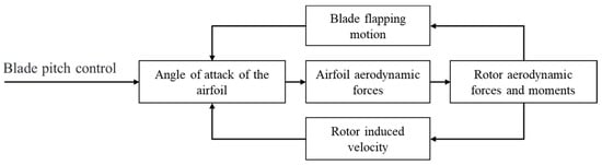 1. The rotor is an important component of a tilt-rotor aircraft, providing both lift and thrust. In helicopter mode and conversion mode, the rotor functions as the lifting surface, control surface, and propulsor. In fixed-wing mode, the rotor acts as a propeller for high-speed forward flight. The aerodynamic forces of the rotor are influenced by the flapping motion of the blade and rotor-induced velocity, as shown in Figure 5. These forces and moments are calculated using the blade element theory. Lift, drag, and moment are determined for each blade element using a table lookup method, which considers flow separation and transonic compressibility effects.