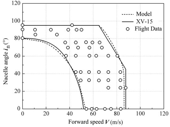 where the critical angle of attack ( and ) can be obtained from wind tunnel data []. The maximum forward speed in the conversion procedure is limited by the compressibility of the advancing rotor blade, the stall effect of the retreating rotor blade, and the available power and dynamic stability of the rotor, among which the available power of the rotor is dominant. Therefore, the path constraint determined by the upper conversion envelope is: