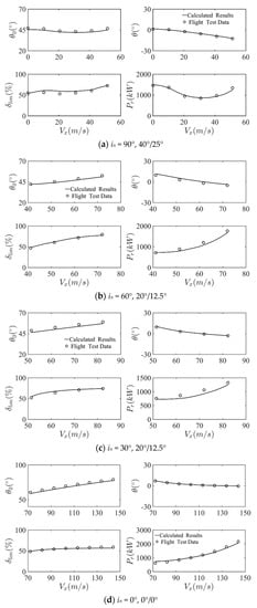 The flight test data of a XV-15 tilt-rotor aircraft (gross weight of 5897 kg) are utilized as a sample for steady-state analysis in three modes of flight. Figure 7 and Figure 8 show a comparison between the predicted results and the flight test data []. Figure 8 shows the collective pitch angle (), longitudinal stick displacement, vehicle pitch attitude, and total power required (Pr) against the flight test data for helicopter mode () with a flap/aileron setting of , conversion mode ( and ) with a flap/aileron setting of , and fixed-wing aircraft mode () with a flap/aileron setting of . Vx represents the forward speed. The calculated steady-state variables are in agreement with the flight test data.