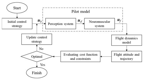The primary task of the pilot is to perceive the current flight situation and determine appropriate control strategies based on the flight mission in order to manipulate the aircraft. Therefore, a pilot model generally needs to describe three characteristics of the pilot: perception system, control behavior, and neuromuscular system. Since the optimal control model developed in this paper can describe the desired flight mission through cost function, path constraints, and boundary conditions and obtain suitable control strategies through a numerical solution, it can be assumed that the pilot’s control behavior is already incorporated into the optimal control model established in this paper [], as shown in Figure 9, where ud represents the delayed command inputs, and uf represents the final control input to actuate the flight dynamics model. This section only requires the establishment of a model that describes the pilot’s perception system and neuromuscular system.