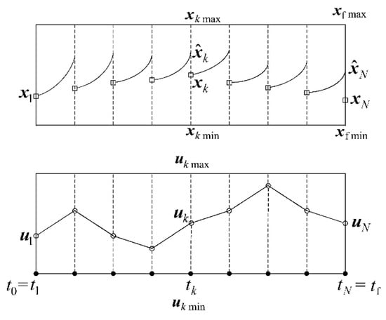 At present, the most effective and flexible approach to solve NOCP is to convert the NOCP into a nonlinear programming (NLP) problem via a collocation approach, which can then be solved with a nonlinear programming algorithm. In this paper, a collection approach called direct multiple shooting [] is applied to transcribe the NOCP directly into a discrete NLP by breaking the states and controls of the continuous conversion procedure into shorter time segments. This approach is typically used in the applications of high complexity and/or with a large number of degrees of freedom []. The fundamental idea of a direct multiple-shooting approach is shown in Figure 10.