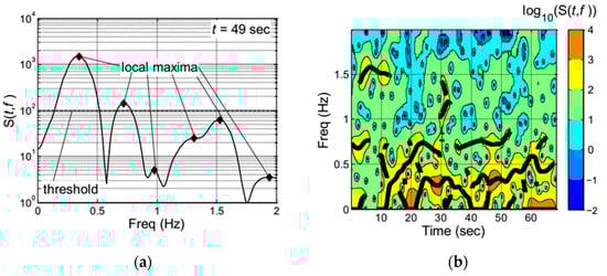 2. The subsequent step in the multifrequency approach involves the mathematical identification of consecutive local maxima in time that signify continuous features in the TFR. Specifically, we aim to identify pairs of local maxima occurring at (or close to) the same frequency. In our study, we employed a threshold of 0.02 Hz to determine the continuity between two local maxima at consecutive time instants. This step essentially seeks to mathematically pinpoint the “peaks” and “ridgelines” in the topographical representation of the TFR, as illustrated in Figure 11b.