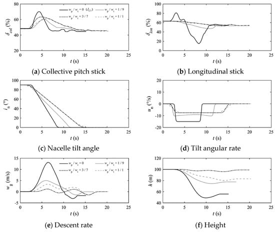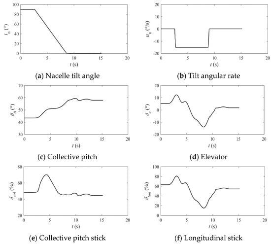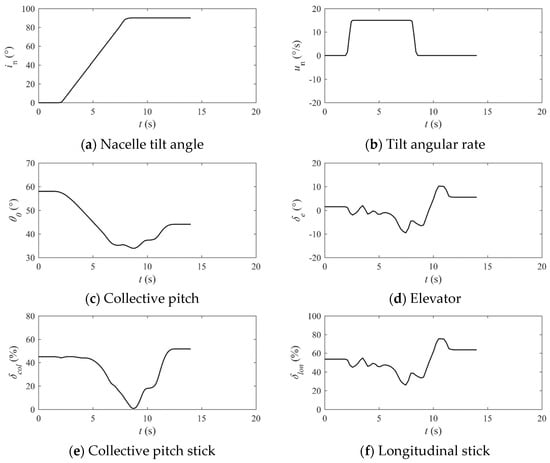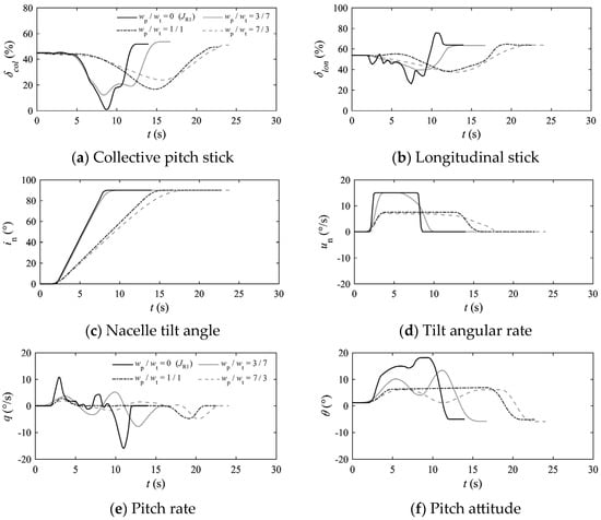 (1) When the performance index considers the weight coefficient of pilot workload, the magnitude of collective stick inputs and longitudinal stick inputs are significantly reduced, promoting smoother changes in height and pitch attitude. Additionally, tilting of the engine nacelle can be accomplished at a lower and fixed angular rate. However, the pilot workload weight coefficient should not be too dominant; otherwise, overly smooth collective and longitudinal stick manipulation leads to a decrease in height.