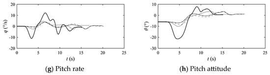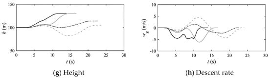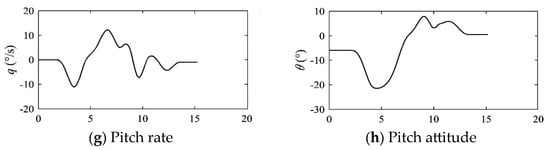 Figure 19 shows the pilot control strategy and flight state under different wp/wt values. It can be concluded that when the ratio of wp/wt is 1/1 for the reconversion procedure, pilot manipulation is smooth, the height change is small, and the tilting process of the engine nacelle can be basically realized by the constant-angular-rate automatic tilting system (stabilized at 7.5°/s).