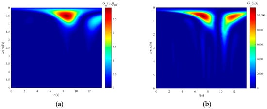 Figure 20a shows the wavelet transform result of the collective pitch stick. It can be observed that the overall energy distribution of the collective pitch stick is similar to that shown in Figure 18a, but the maximum energy input is significantly reduced by 66%, as shown in Table 3. The main energy inputs are concentrated around 0.2 rad/s to 0.8 rad/s, and the low-energy (small-amplitude), high-frequency components are also less than 1.7 rad/s. Figure 20b displays the wavelet transform result of the longitudinal stick. A comparison with Figure 18b and Table 3 reveals a 36% decrease in the maximum energy of the longitudinal stick and a significant reduction in high-frequency components. The low-energy (small-amplitude), high-frequency components that appear after 12 s and 18 s are also less than 2 rad/s.