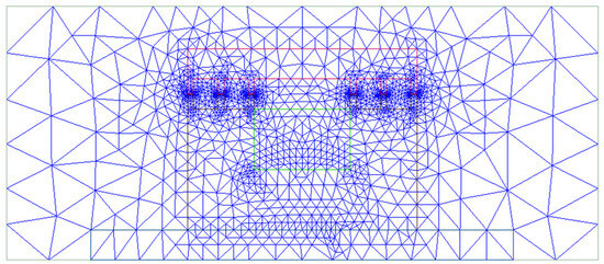 The finite element meshing determines the accuracy and reliability of the model. Generally, the higher the number of mesh elements used, the smaller the discretization error generated by the finite element model. However, an excessive number of mesh elements will increase the calculation time. Therefore, choosing an appropriate mesh is of utmost importance in finite element simulations. In this work, we select a triangular mesh for partitioning and a magnetostatic for solving. The maximum length of the grid in each region of the model is limited, and the parameter settings for the grid in each region are listed in Table 2. The grid division result is shown in Figure 3, and the coils are meshed more densely to improve accuracy.