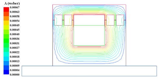 After the geometric modeling of the electromagnetic spring, boundary conditions need to be defined for the model to facilitate the subsequent magnetic field analysis. The balloon boundary conditions, also known as infinite boundary conditions, are used in this work. The scope of the balloon boundary is to surround the entire model, as shown in the outermost border of Figure 2. When solving the balloon boundary conditions, the boundary at infinity is regarded as a spherical balloon so that the magnetic field at the boundary can be treated reasonably. The magnetic flux density distribution and magnetic force line distribution of the model, when the TES is in the equilibrium state, are shown in Figure 5 and Figure 6, respectively. It can be seen from Figure 5 that the magnetic flux density at the magnetic teeth of the electromagnetic spring is significantly higher than that at other locations, which indicates that the design of the electromagnetic spring is reasonable. From Figure 6, the magnetic field distribution of the model spring is basically consistent with the magnetic circuit distribution, and almost no leakage occurs.