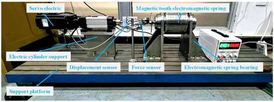 The experimental setup used to measure the static electromagnetic force of the TES is shown in Figure 7. Firstly, the electromagnetic spring actuator was set to be in equilibrium, and this position was set as the displacement origin. Then, direct current was applied to the electromagnetic coil, and the electric cylinder was controlled to move the actuator within a certain range. It is worth noting that the movement was carried out in steps of 0.1 mm, and the electromagnetic force and displacement data were recorded. After completing one experimental cycle, the input direct current was adjusted in steps of 0.5 A until the electromagnetic force and displacement measurements were completed at 0.5–2.5 A current. The main technical specifications for the experimental system are illustrated in Table 3.