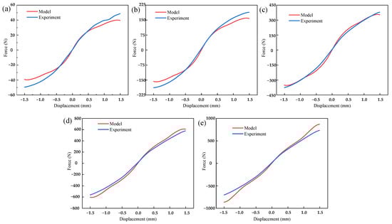 Comparisons of the force–displacement curves of the TES under different currents: (a) 0.5 A, (b) 1.0 A, (c) 1.5 A, (d) 2.0 A, and (e) 2.5 A.
