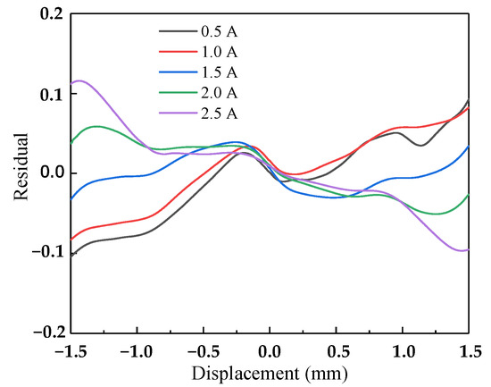 The comparison between the experimental and simulated electromagnetic force (F) generated by the TES and the axial displacement of the rotor (x) curves undercurrents of 0.5–2.5 A, as shown in Figure 8. It can be seen from Figure 8 that the finite element simulation results are in good agreement with the experimental data. The calculation results overlap to a great extent with the experimental data when the displacement is small, but when the displacement is large, the discrepancy between the curves increases accordingly. It is worth noting that when the displacement is large, the discrepancy first decreases and then increases with the current. The main reason for this phenomenon is that there are machining and assembly errors in the actual processing of the electromagnetic spring [20,21]. Furthermore, the structural deformation of the electromagnetic spring also causes a deviation between the measured displacement and the actual displacement. Thus, the normalized residual analysis is adopted to evaluate the prediction accuracy. The results of the normalized residual analysis are shown in Figure 9, and the normalized residual analysis can be expressed as