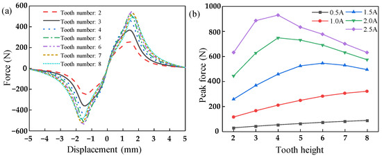 The underlying mechanism of the electromagnetic force of the magnetic-toothed electromagnetic spring is the superposition of the interaction forces between tooth pairs. Therefore, the number of magnetic teeth plays an important role in determining the electromagnetic force characteristics. The number of magnetic teeth was set to be within the range of 2–8 while ensuring that the structural parameters of the teeth remained unchanged (the tooth height = 5 mm and tooth width = 2 mm). Based on the simulation results under a 1.5 A current, the electromagnetic force–displacement curves for different numbers of teeth were recorded, as shown in Figure 10a. At the same time, for a given number of teeth, different currents were used to simulate the electromagnetic force, and the influence of the number of teeth on the maximum electromagnetic force under the different currents is shown in Figure 10b.