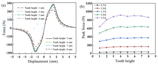 Electromagnetic force characteristics for different tooth heights: (a) electromagnetic force–displacement curve and (b) maximum electromagnetic force under different currents.