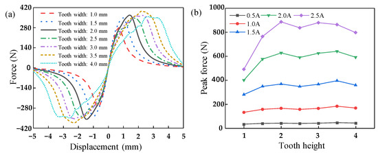 The tooth width is related to the motion displacement of the electromagnetic force, and the electromagnetic force mainly originates from the area where the tooth is directly opposite to each other. Therefore, keeping other structural parameters unchanged (the number of teeth = 3, and tooth height = 2 mm), the influence of the tooth width on the electromagnetic force characteristics is studied in this section by changing the magnetic tooth width from 1 to 4 mm in steps of 0.5 mm, as shown in Figure 12. Figure 12a shows the electromagnetic force–displacement curves for different tooth widths at a current of 1.5 A. Figure 12b presents the maximum electromagnetic force generated by different tooth widths under different currents.