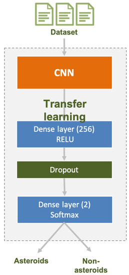 The flatten layer (see Figure 2) was added to transform the multidimensional output received as an input from the previous layers (coming from InceptionV3, Xception, etc.) into a unidimensional dataset. In our case, this layer transforms the feature maps computed by the previous convolution and pooling layers into the data needed by the Dense layer that follows. The dense layer performs the actual classification of the input data by training a set of parameters using a back-propagation mechanism. In this layer, each neuron is connected to every neuron in the previous layer. The connections have weights that are learned during training. To reduce the overfitting that could arise, we added a dropout layer that randomly ignores some neurons during training in the forward- and back-propagation mechanisms. In this manner, we tried to minimize the development of dependencies between neurons during the training phase. The last layer, also a Dense layer, is based on softmax and generates the probability of membership for each of the two classes, asteroids and non-asteroids.