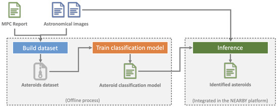The results presented in this paper are part of the CERES software module for asteroid detection from astronomical images. It is composed of three modules (see Figure 3): one module for creating the image dataset that is used for training a classification model, one module for classifying objects detected from astronomical images for the purpose of identifying asteroids, and the inference module that is integrated into the NEARBY platform.