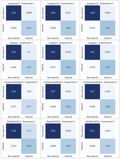 In the experiments detailed in this paper, we employed transfer learning and fine-tuning techniques on established deep convolutional networks that were initially pretrained using the ImageNet dataset. Figure 6 presents, by comparison, the confusion matrices for each of the experiments performed on each CNN based architectures. The best results, in terms of recall for the asteroid class, were obtained using InceptionV3 by fine-tuning of some of the parameters. We obtained a recall of 0.95 in this scenario. InceptionResNetV2 has the lower recall due to simply performing transfer learning without training some of the base model layers. The performance of the Xception model is similar to that of the InceptionV3 model.