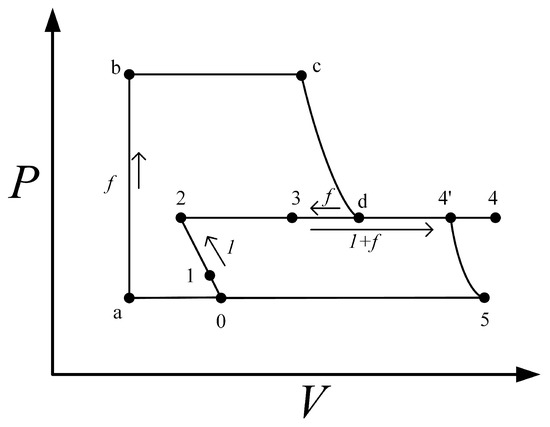 Figure 2 and Figure 3 are the P-V diagram and the T-s diagram of an ideal turboexpander engine cycle. The processes with Arabic numerals stand for air and gas, and the processes with lowercase English letters stand for fuel. In the figure, 0–1 is the compression process of the intake; 1–2 is the isentropic compression process of the compressor or fan; and 2–3 and d–3 show the mixing process of air and fuel in the front of combustor. Before mixing the fuel with air, a–b is the compression process of the pump, and b–c is the heating process of the cold side, where the heat is from the combustion in the combustor. After the mixing process, 3–4 stands for the combustion process; 4–4’ stands for the heat exchange on the hot side; and 4’–5 is the process that the gas ideally expands to ambient pressure through the nozzle and generates power.