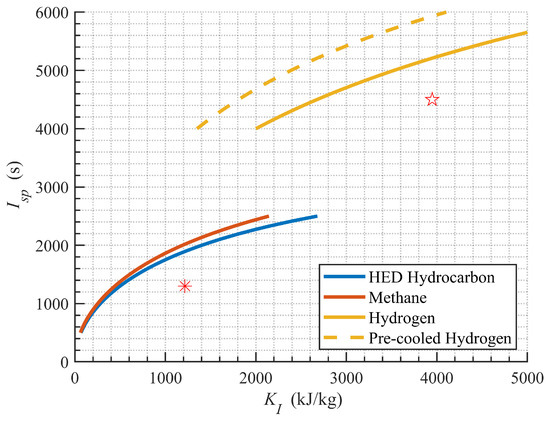 Variation of the design specification of specific impulse with the minimum feasibility factor. Star and asterisk mean LH2 in Ref. [17] and pre-cooled methane in Ref. [22], respectively.