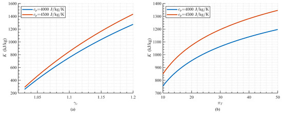 For turboexpander engines with different fuels, the main differences are the design parameters, mostly with regard to K. Hydrocarbon fuels used for aircraft propulsion systems have closed and , where generally does not exceed 48 MJ/kg, and is around 0.067, so the factor K can be considered as the theoretical minimum requirement for the turboexpander engine in the design . Rearranging and simplifying Equation (8), K can be expressed as Equation (10):