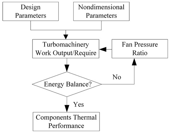 where is the total pressure recovery of the fuel in the heat exchanger. Also, due to the work balance limitation, iterative calculation is needed as shown in Figure 6 [22]. The input design parameters include the design expansion ratio of the turboexpander and the fuel type, and non-dimensional parameters include the coefficients and efficiencies of each component. Based on the calculated fan pressure ratio , the pressure and temperature of fan outlets and can be obtained. Furthermore, the power of the fuel pump, fan, and turboexpander can be calculated by Equation (14) to Equation (16) [32]: