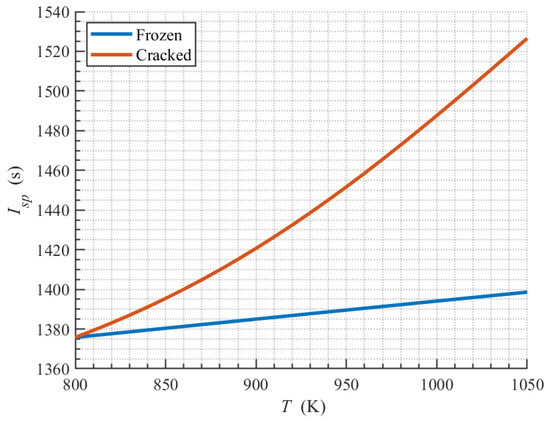 The inlet fuel temperature is another important parameter in the cycle design. The variation in performance with different values of is calculated using the RP-3 fuel, which is shown in Figure 7. Under the temperature range of 800 to 1050 K, the increase in leads to an increase in specific impulse, but the performance with a variable physical property condition is much higher than that of the frozen physical property condition. The curve in the frozen assumption is almost linear, and the specific impulse is 8.42% lower than the value when cracking is considered at 1050 K. This is because, in addition to the output power of the turboexpander, also influences the conversion ratio of the fuel. A higher can increase the conversion ratio and decrease the average molar mass of crack production, further increasing and to improve the engine performance.