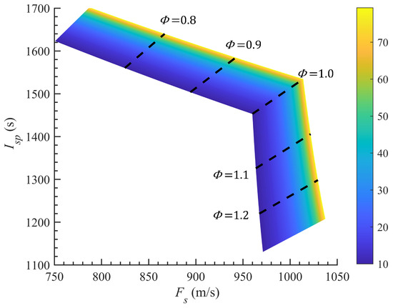 Although the design can use a high-expansion-ratio turbine to compensate for the lack of working ability of the HED hydrocarbon fuel, the heat exchanger and turbine may be extremely difficult to design and manufacture. For example, if is 100, the outlet pressure of the fuel pump will be as high as 32.34 MPa, which is unrealistic. Therefore, the expansion ratio of the engine should be carefully chosen in the design. Since the hydrocarbon-fueled turboexpander engine aims at the low Mach number acceleration of the reusable hypersonic vehicle, the high specific impulse means that the engine is more fuel-efficient for a certain period of time. However, if the specific impulse of the engine is increased by reducing the equivalence ratio, the reduction in the specific thrust will lead to a lower thrust and acceleration of the vehicle, and more time will be wasted in this process, which has a negative effect on fuel consumption that may affect the payload mass.
